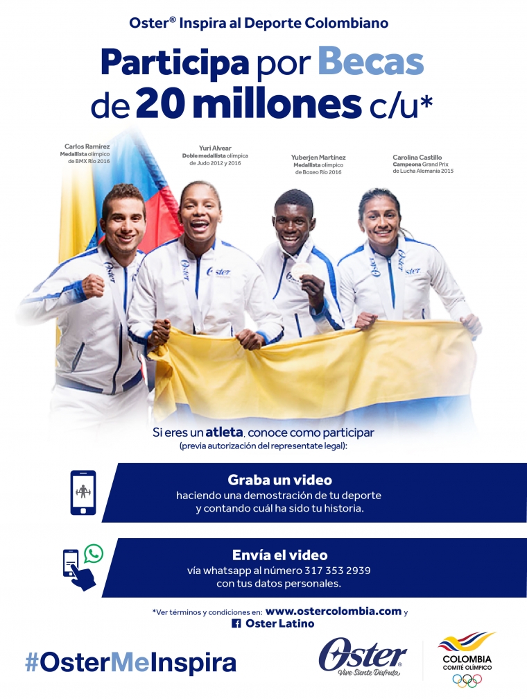 Esta convocatoria nacional tiene como objetivo principal el fortalecimiento del deporte nacional de cara a los Juegos Olímpicos de la Juventud que tendrán lugar en Buenos Aires (Argentina) en 2018. En total se entregarán seis becas de 20 millones de pesos cada una y que podrán incrementarse cada vez que los colombianos compren electrodomésticos marca Oster.